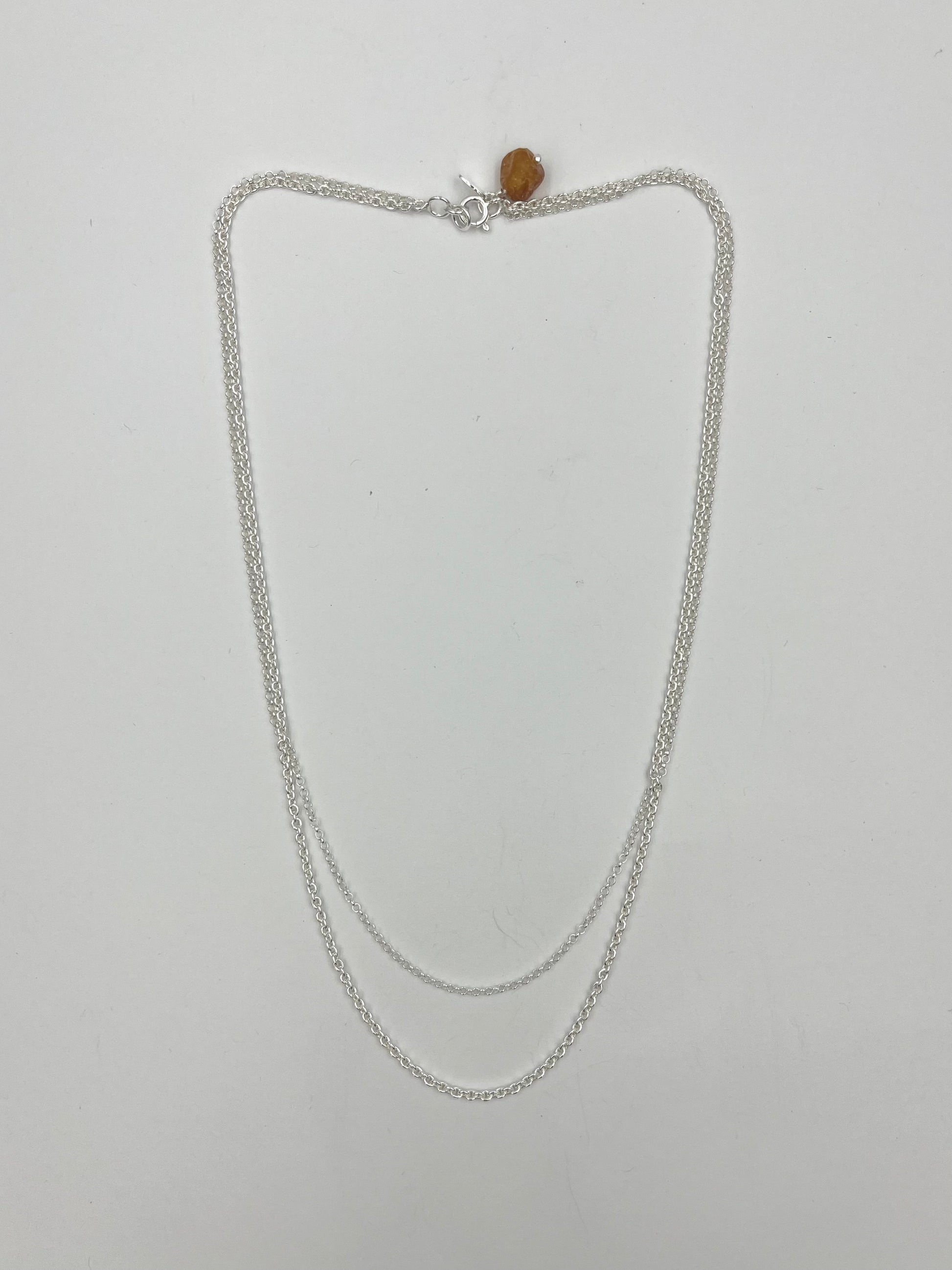 RO is an elegant and delicate amber necklace, perfect for both everyday wear and festive occasions. It features a double-chain design with a small piece of amber as a subtle detail in the clasp. The amber is found along the coast of Thy left in its natural, sea-polished form.