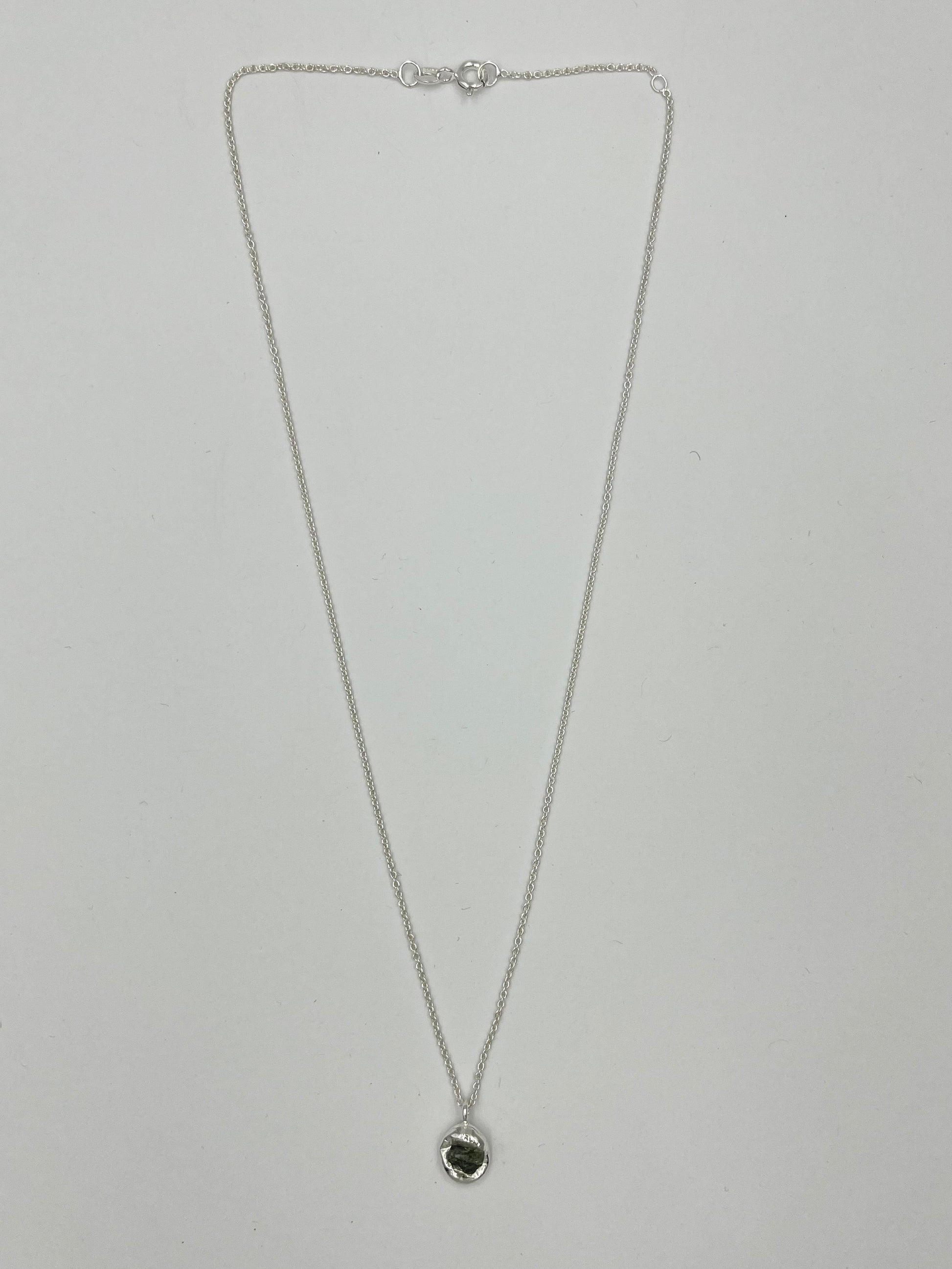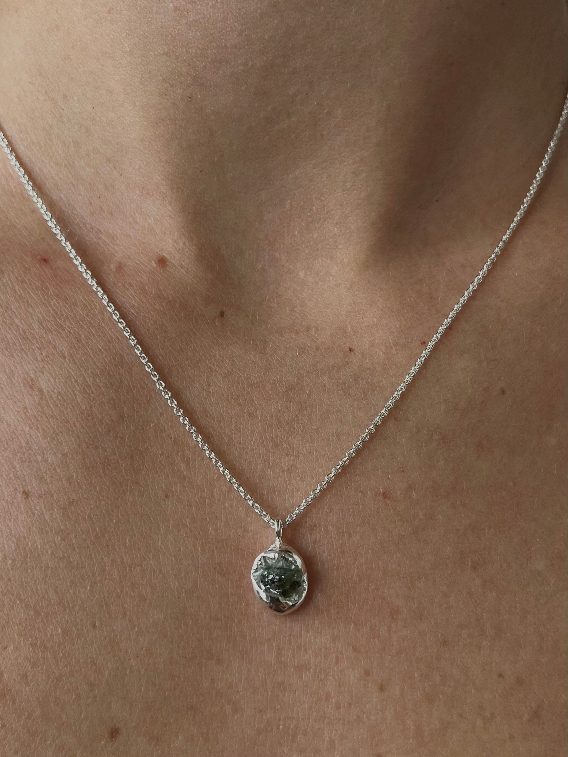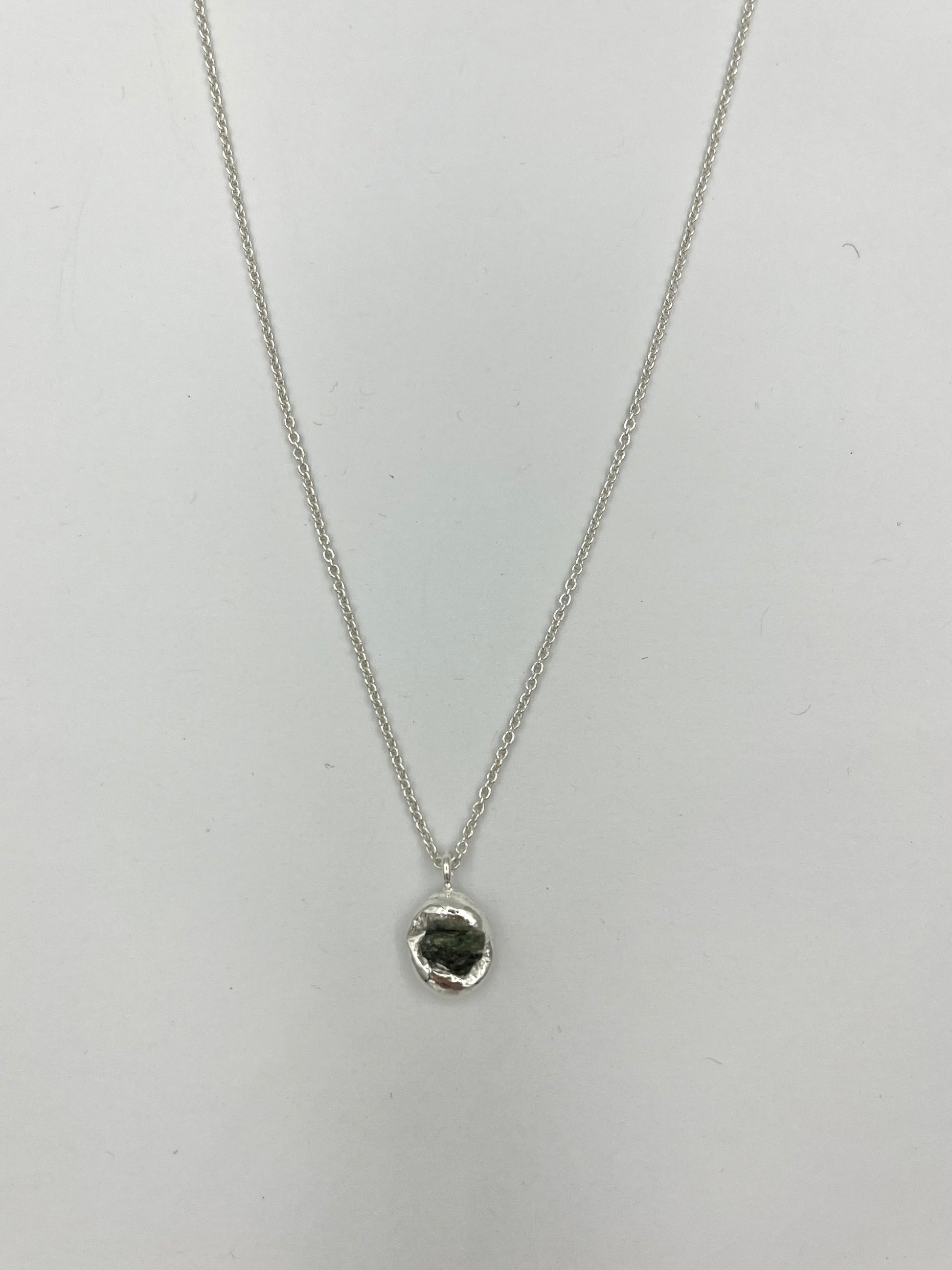 SAFIR necklace is a unique piece where a raw sapphire has been encased in silver. This necklace features a dark green sapphire. It is the perfect everyday necklace but can also be worn for more formal occasions.
