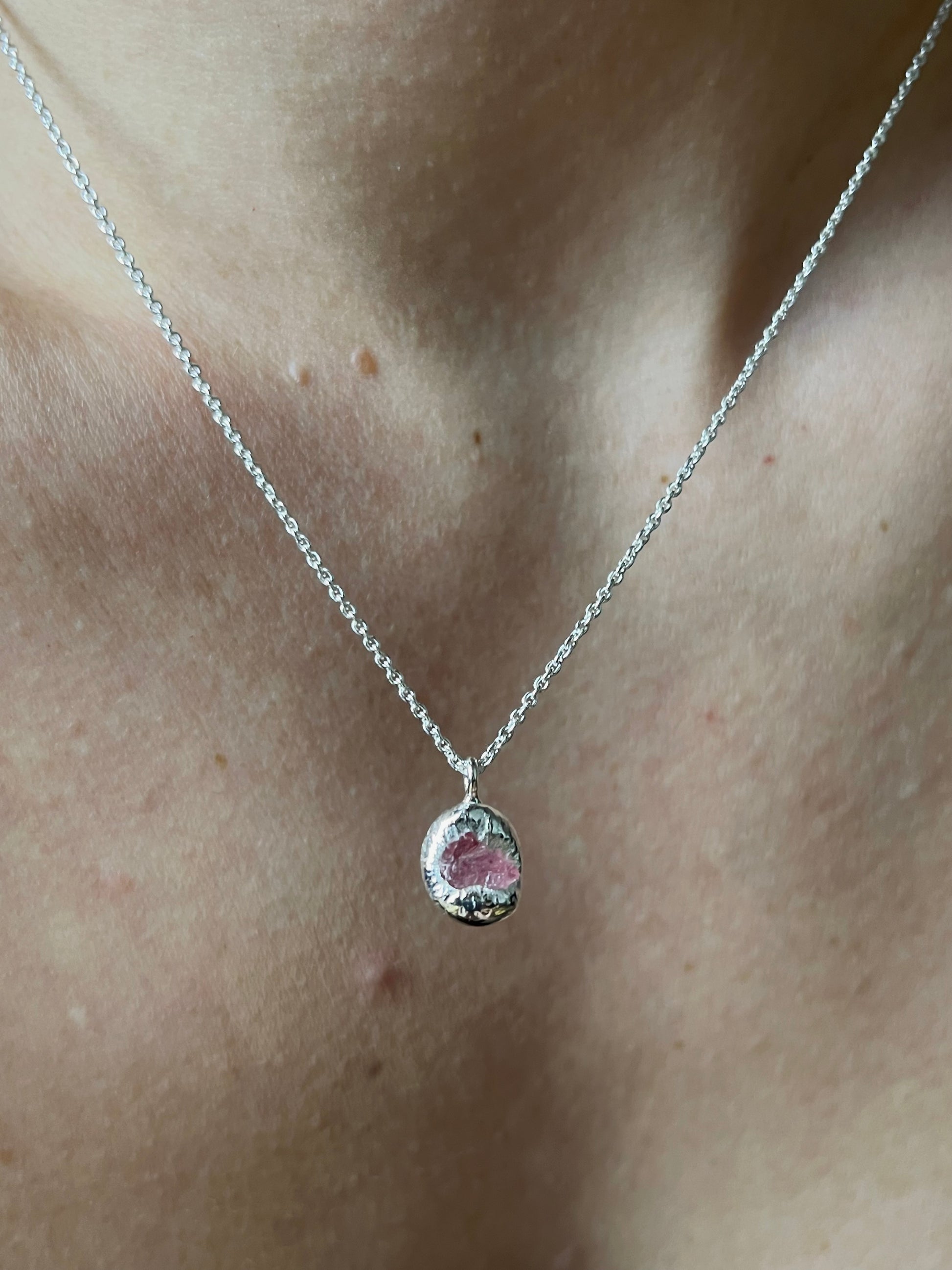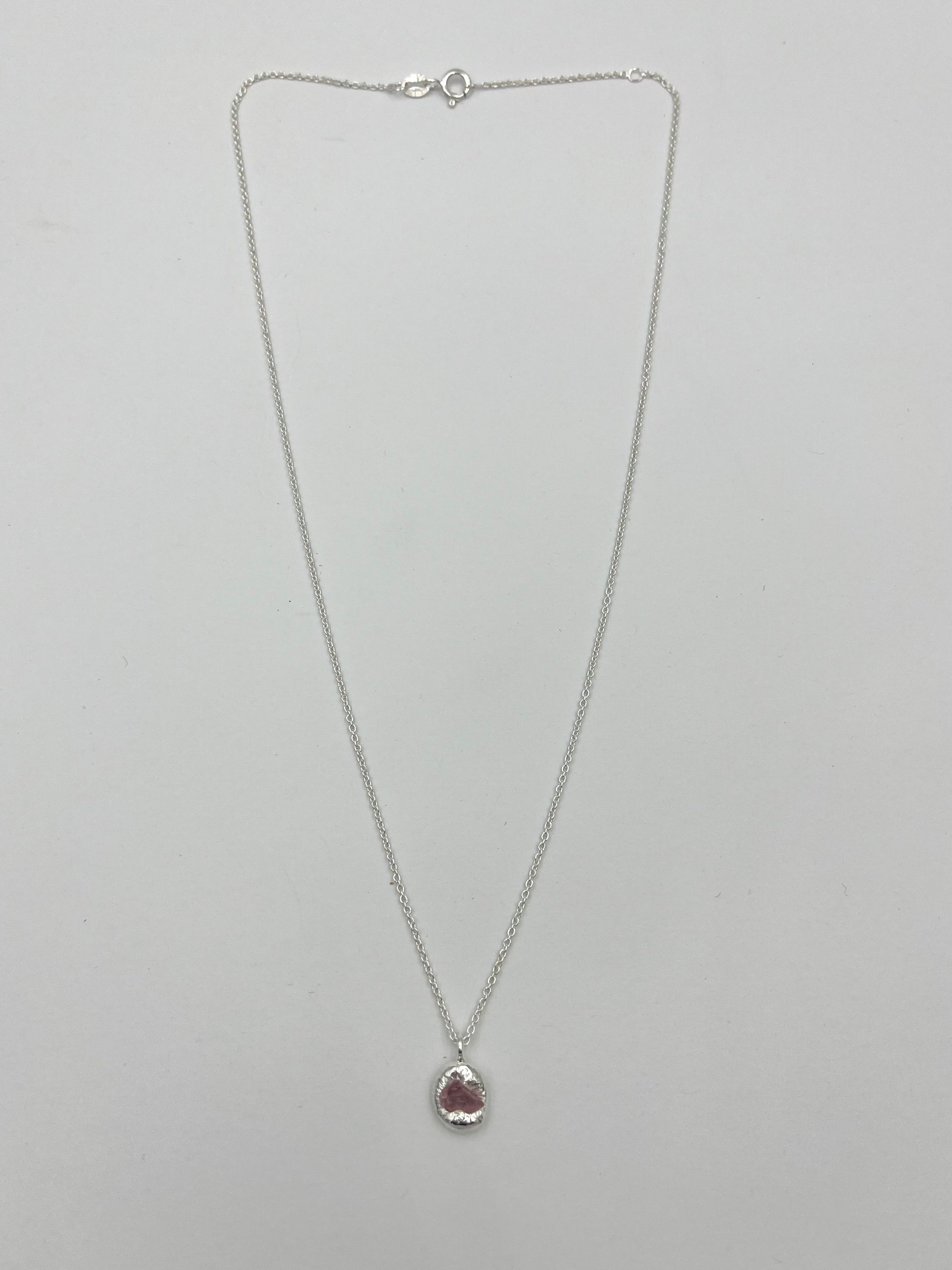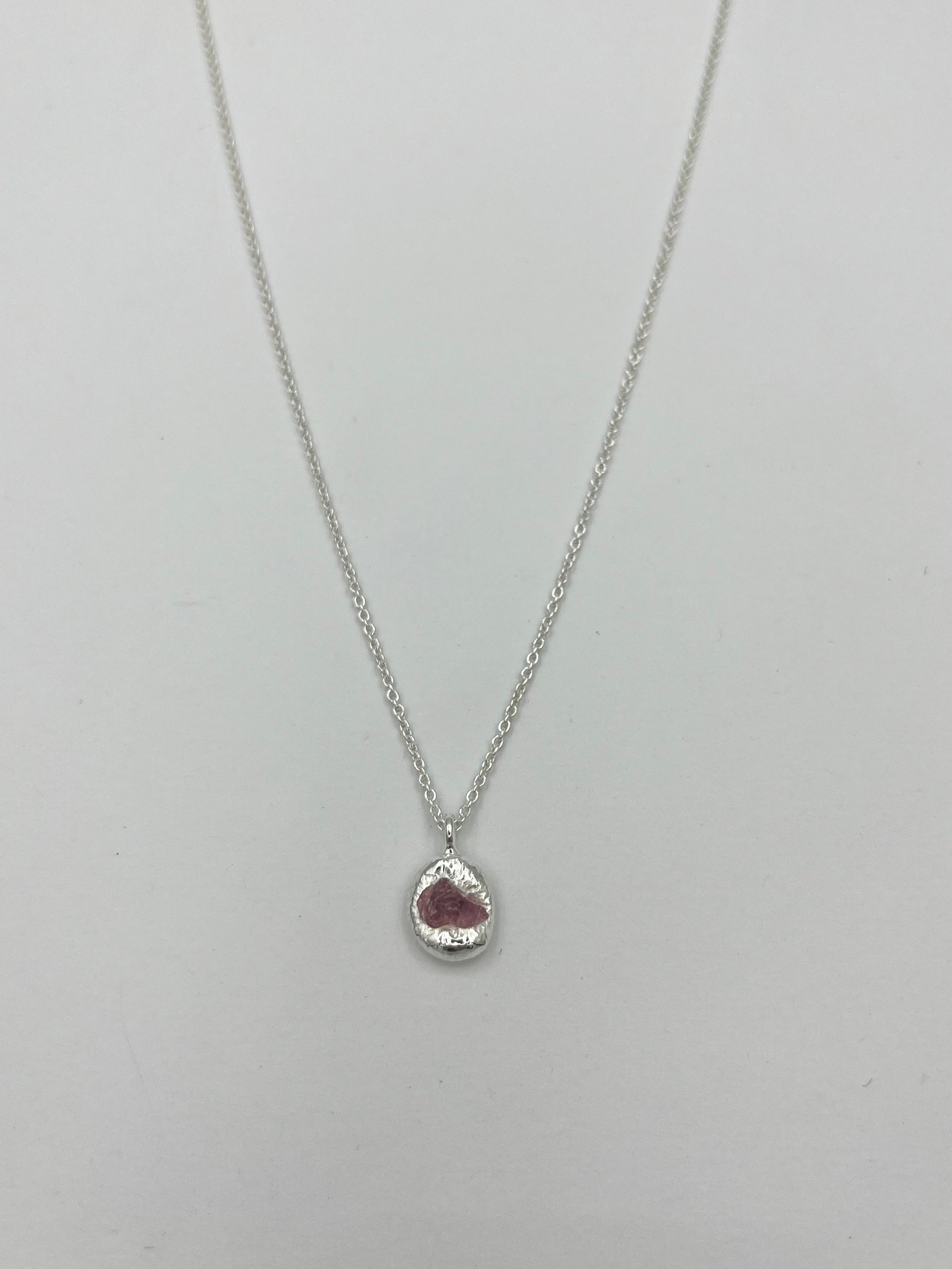 SAFIR necklace is a unique piece where a raw sapphire has been encased in silver. This necklace features a light rose sapphire. It is the perfect everyday necklace but can also be worn for more formal occasions.
